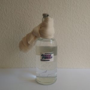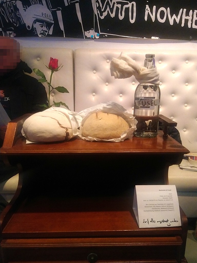 Backstein & Fusel reflektiert kreative Protestformen gegen soziale und politische Unterdrückung. Das Werk besteht aus einem harten Brot aus Salz- und Sauerteig und einer Flasche mit einer Flüssigkeit aus 2/3 Weinbrand und 1/3 Kochsalzlösung, theoretisch brennbar. Beide Objekte stehen für Wut, Widerstand und die Möglichkeit friedlicher, ressourcenschonender Aktionen. Die Arbeit lädt dazu ein, über Grundbedürfnisse, sozialen Ausschluss und die politische Dimension alltäglicher Dinge nachzudenken.