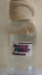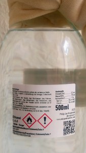 Brot (Salzteig aus Sauerteig mit Laugenbad, Weizenmehl, Salz, Wasser, Natron), Brotpapier, Glasflaschen, Weinbrand (Ethanol), Kochsalzlösung, Käsetuch, Sprach-KI (ChatGPT)
