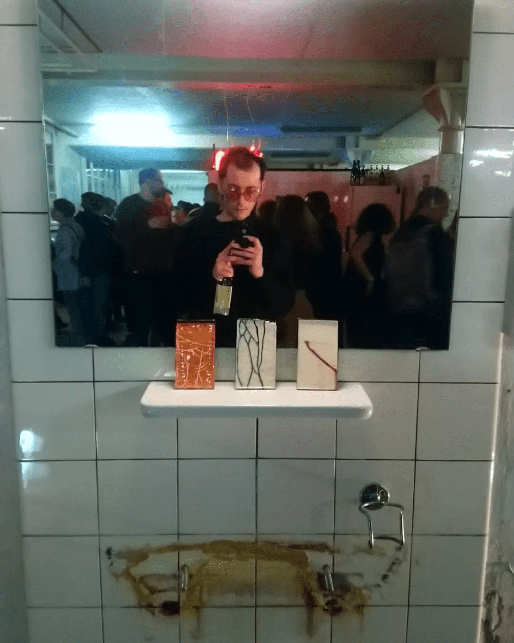 Delicacy, vulnerability, and the need to reconnect with the body form the leitmotif. The space in Waschraum echoes fragile bodies. Placed on and against the tiles, a gentle ache resounds. The flatterers may be perceived with caution in the hand.