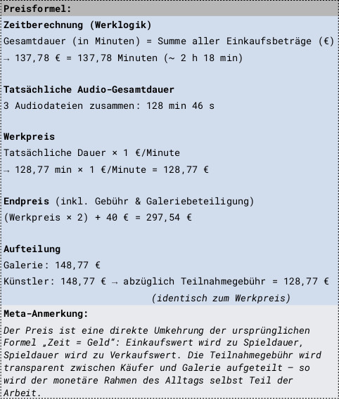 (Anmerkung: Die Preisgestaltung folgt, ebenso wie die Zeitberechnung, einer aus den Kassenzetteln abgeleiteten Eigenlogik und ist Teil des Werks.)